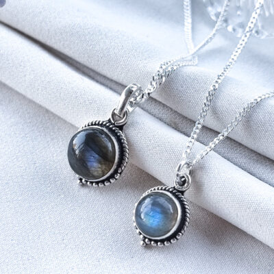 La labradorita es una piedra altamente mística y protectora, desvía fuerzas no deseadas del aura y forma una barrera ante las energías negativas, disipa miedos e inseguridades brindando equilibrio. Fortalece la fe en el yo y la confianza en el universo. Calma la mente hiperactiva y energetiza la imaginación.