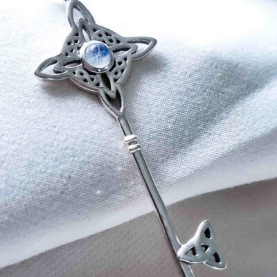 La Llave simboliza la apertura de nuevas oportunidades y el acceso a la sabiduría interior. El Nudo de Bruja actúa como protección contra la negatividad, hechizos y los obstáculos. La triqueta simboliza unidad, conexión espiritual y la trinidad (cuerpo, mente, espíritu), promueve el equilibrio y la armonía en todas las áreas de la vida. La piedra luna a es una piedra llamada “piedra de los nuevos comienzos”, abre la mente a impulsos repentinos e irracionales y, emocionalmente alivia la inestabilidad emocional y el estrés, estabilizándolos.