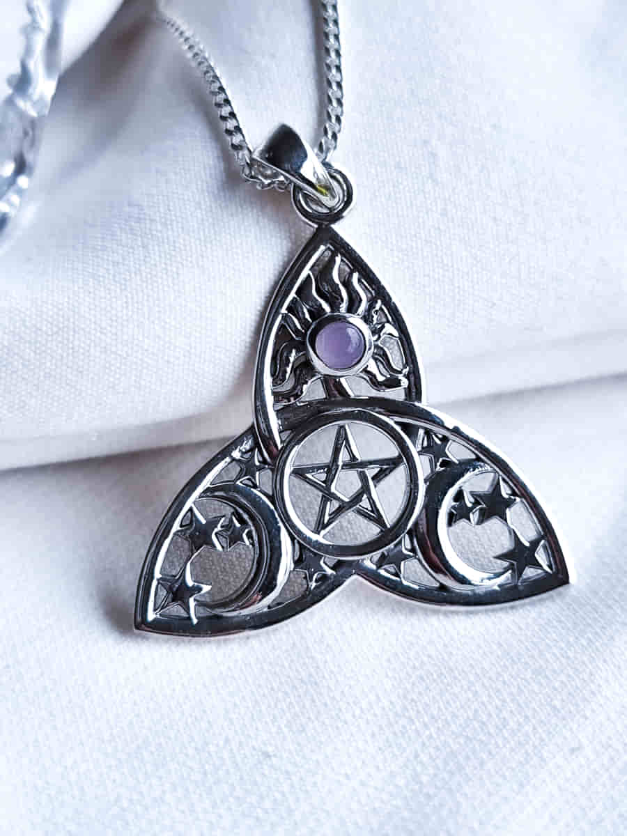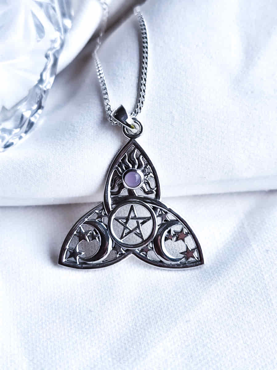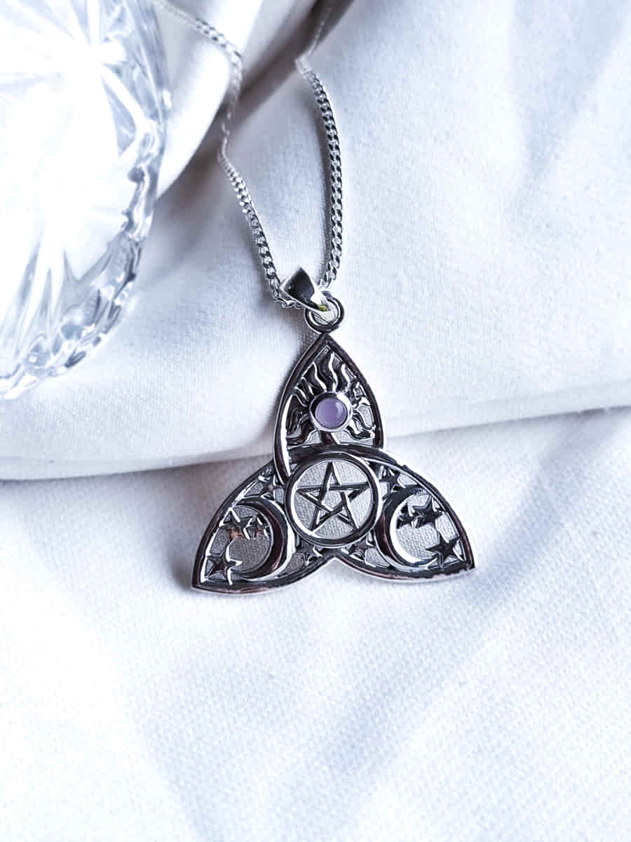 Colgante Triqueta con Pentagrama, Sol, Lunas y Cuarzo Rosa