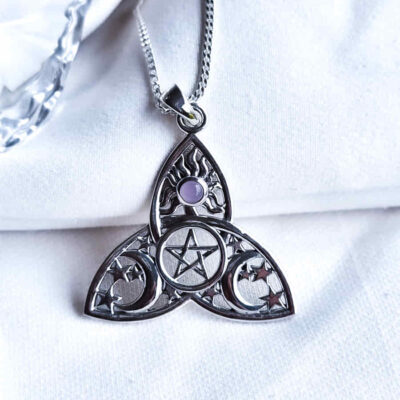 El colgante Triqueta con Pentagrama, Sol, Lunas y Cuarzo Rosa une símbolos de protección y equilibrio espiritual. La triqueta representa la unión de cuerpo, mente y espíritu; el pentagrama actúa como amuleto protector y canal de energías positivas; el sol aporta vitalidad, claridad y fuerza interior; las lunas potencian la intuición y los ciclos de transformación. El cuarzo rosa armoniza el corazón, favorece el amor propio y la calma emocional, ayudando a sanar y atraer relaciones sanas. Juntos, estos elementos brindan protección, energía positiva, intuición y un profundo equilibrio afectivo y espiritual.
