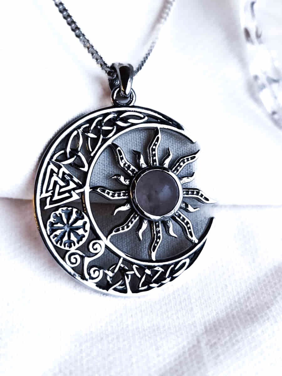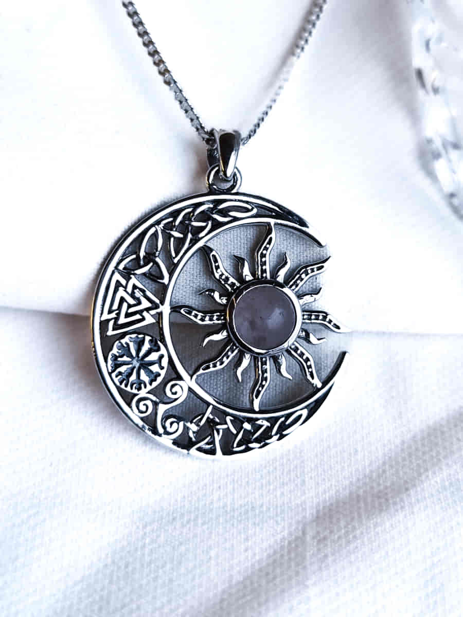 Colgante Valknut Sol y Luna de 5 Amuletos con Cuarzo Rosa