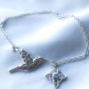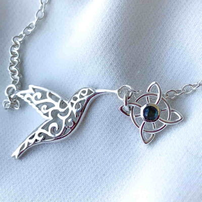 El nudo de bruja es un poderoso amuleto que elimina la negatividad y protege contra hechizos. La labradorita desvía energías no deseadas y brinda equilibrio emocional. El colibrí simboliza alegría y amor, inspirando positividad y conexión espiritual. Juntos, ofrecen protección, alegría y equilibrio emocional para enfrentar la vida con positividad.